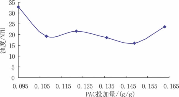 離心性能通常是用上清液的濁度來評價(jià)的,因此,實(shí)驗(yàn)中通過測定離心后上清液的濁度,來考察 PAC 對污泥離心性能的影響。在離心時(shí)間5 min,轉(zhuǎn)速3 000 r /min,PAC 不同投加量條件下,上清液濁度如圖4 所示。從圖4 可以看出隨著PAC 投加量的增加,上清液的濁度在不斷地降低,在0. 149 g /g 時(shí)達(dá)到較低值,為17 NTU,而當(dāng)PAC 的投加量繼續(xù)增加時(shí),上清液濁度又呈現(xiàn)上升趨勢。這可能是因?yàn)?,PAC 長鏈的橋架吸附作用,使污泥形成較大的絮體,污泥的離心性能得到提升,但是過量的PAC 又會(huì)使得PAC 的長鏈不能得到有效的伸展,造成PAC 的絮凝作用被削弱,從而污泥的離心性能反而變差。